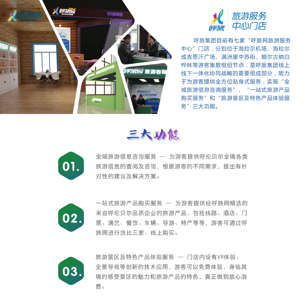 呼旅網(wǎng)和智慧旅游 呼旅網(wǎng) OTA分銷平臺(tái) 呼倫貝爾旅游資源交易平臺(tái) 呼倫貝爾全民營銷 智慧旅游 廣告發(fā)布 IP景區(qū)投資與運(yùn)營 額爾古納白樺林景區(qū) 黑山頭濕地景區(qū) 中蒙貝爾湖跨境旅游 滿洲里美麗之冠 品牌酒店 滿洲里飯店 滿洲里大飯店 尼基金酒店 口岸互貿(mào) 滿洲里中俄互貿(mào)旅游有限公司 新巴爾虎左旗互貿(mào)有限公司 新巴爾虎右旗互貿(mào)旅游有限公司 額爾古納市邊境互貿(mào)有限公司 特產(chǎn)開發(fā)與銷售 草原好物商貿(mào) 旅行社及旅游周邊產(chǎn)業(yè) 旅行社 呼旅微木會(huì)展 中視傳媒